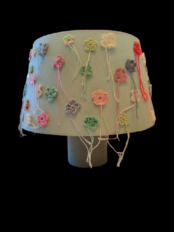 Unieke, duurzame lampenkap versiert met gehaakte bloemetjes van katoen in pasteltinten. Dit is een samenwerkingsproject van verschillende medewerkers. Afmeting: Doorsnede boven 30 cm, onder 39 cm en hoogte 22,5 cm