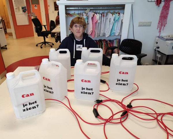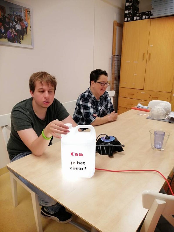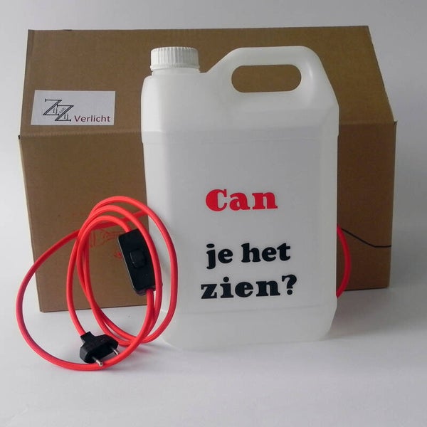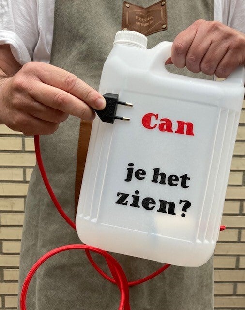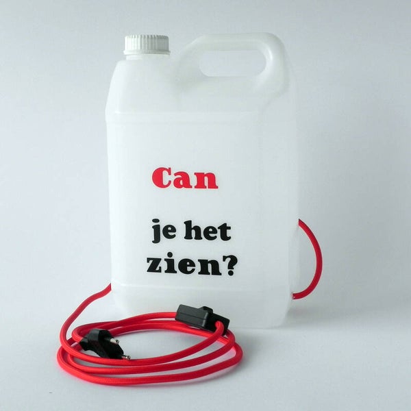 Tafellamp van oude sherry CAN met tekst "CAN je het zien?" Gemaakt door WCS Zij aan Zij i.s.m. locaties de Werf en het Atelier. Afmeting: 20 x 13 x 30 cm. Rood strijksnoer met zwarte stekker en uit/aanknop.