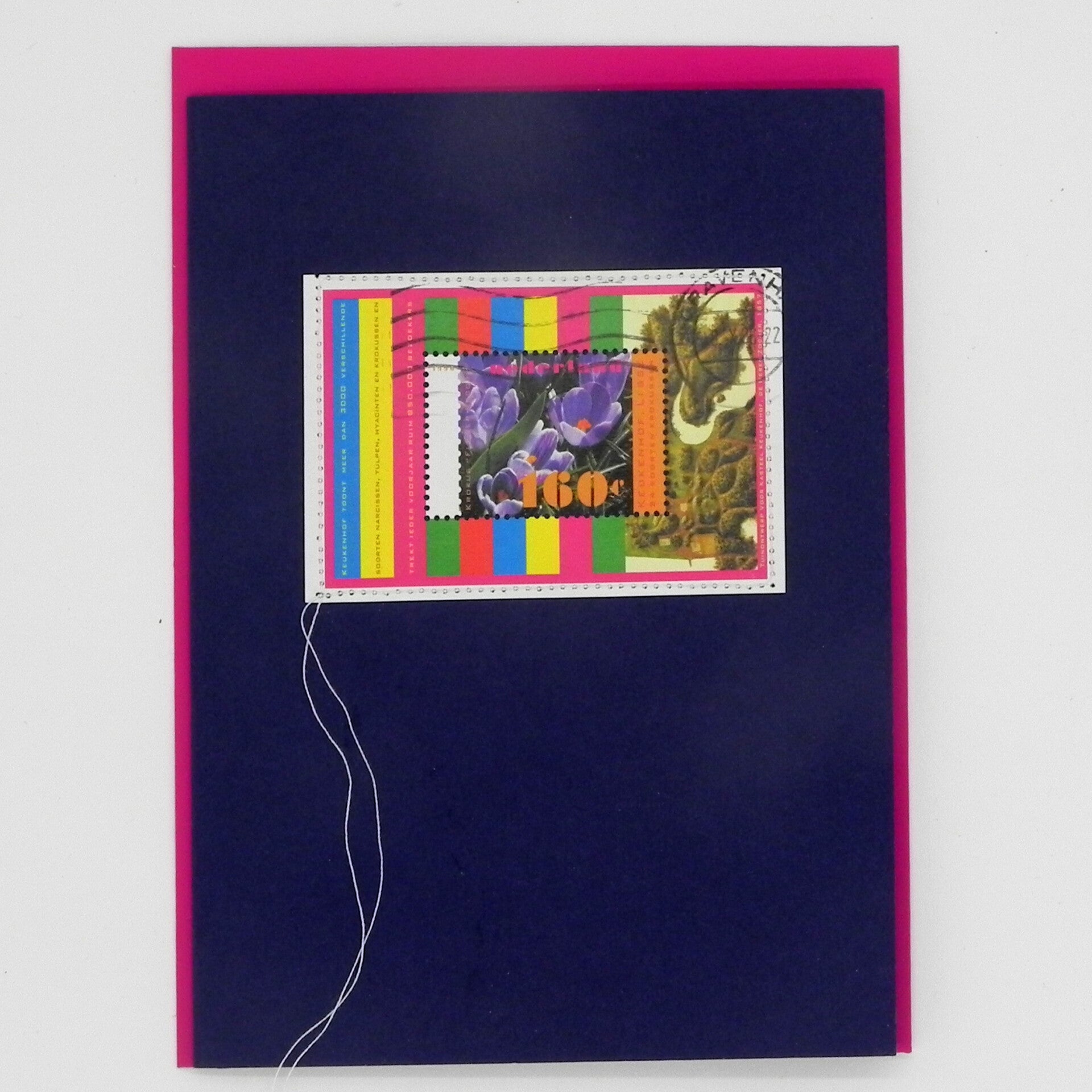 Postzegels gestikt op een kaart met gekleurde envelop, diverse thema's, kinderpostzegels, bloemen, kunst.