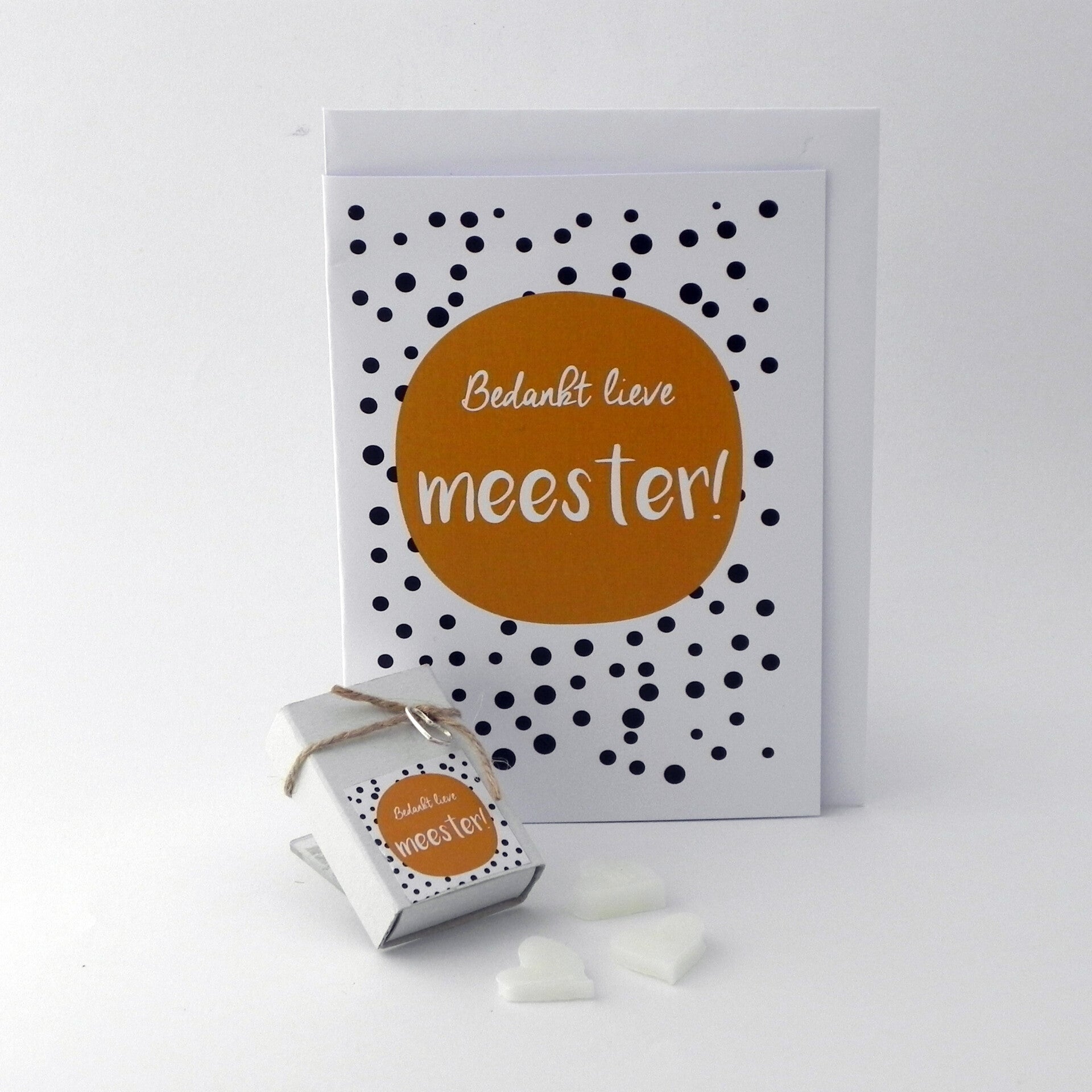 Klein doosje gevuld met witte zeepjes in de vorm van hartjes. Leuk als klein bedankje voor de Juf of Meester.
