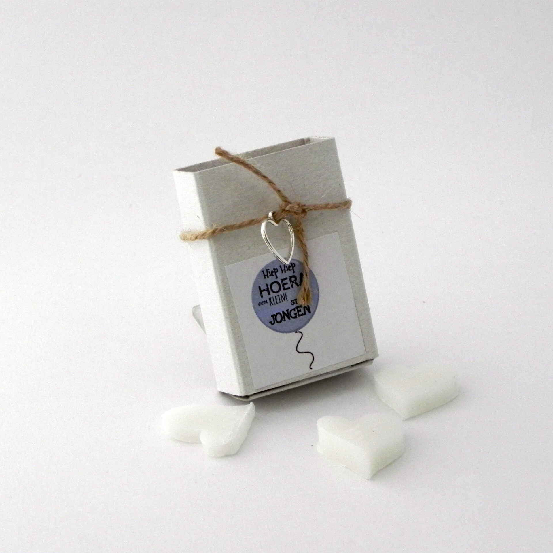 Doosje met kleine witte hartjes zeepjes en verschillende voorkantjes.