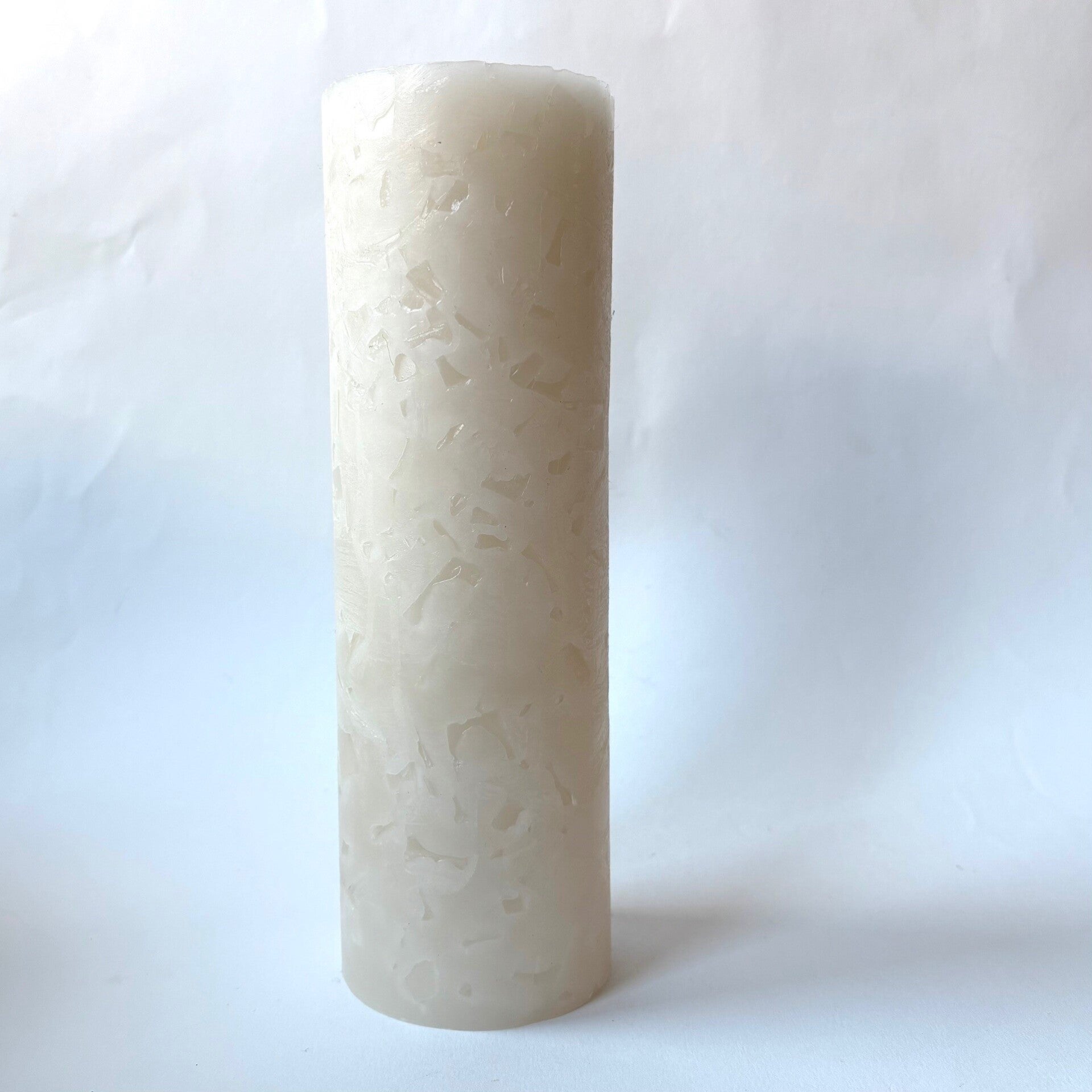 Stompkaarsen in 3 maten opgebouwd uit stukjes kaarsvet in wittinten.