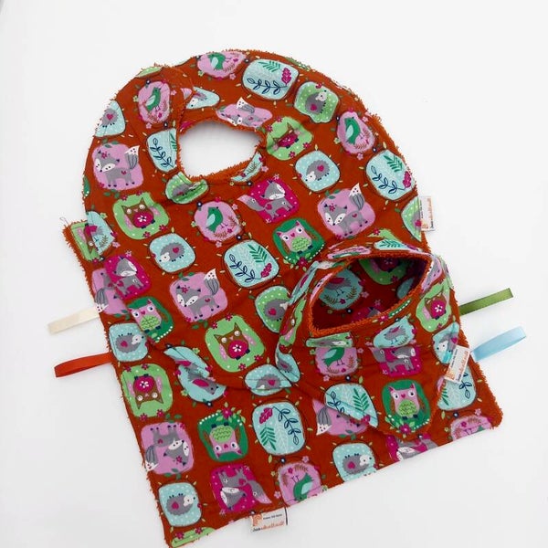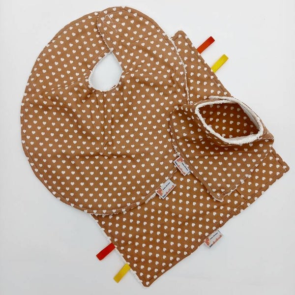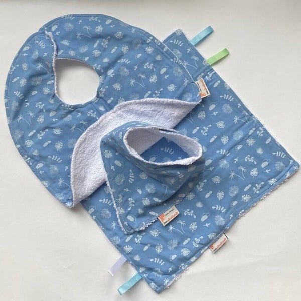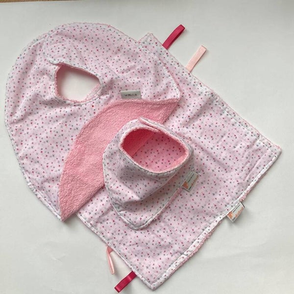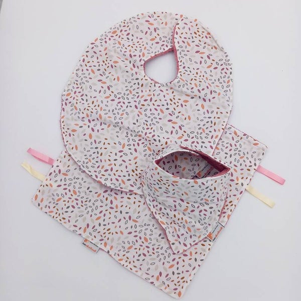 Setje voor een baby, slab, kreukdoekje en sjaaltje in verschillende mooie stofjes gemaakt en verpakt in een brievenbusdoosje, Variant van Katoen.